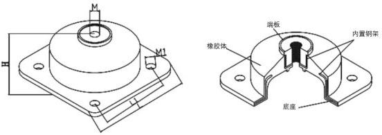 JGD型橡膠剪切隔振器是由內(nèi)、外鋼套和中間的合成橡膠組成,經(jīng)硫化呈中間圓錐體,橡膠部分受剪切力、具有較大的變形范圍和較低的固有頻率。工作溫度范圍在-5oC--+50oC,溫度變化時,剛度也有所變化;阻尼比C/C0>0.07。對于水泵、壓縮機、通風機、發(fā)電機組,冷凍機等機械設備的積極隔振和儀器儀表的消極隔振都有良好的隔振效果。